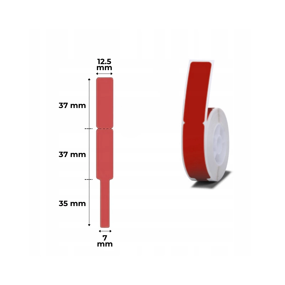 Etykiety do drukarek Niimbot z serii B w kolorze czerwonym. Na rolce znajduje się 65 sztuk w rozmiarze 12.5 x 74 + 35 mm. Etykiety w pozycji wertykalnej (pionowej).
