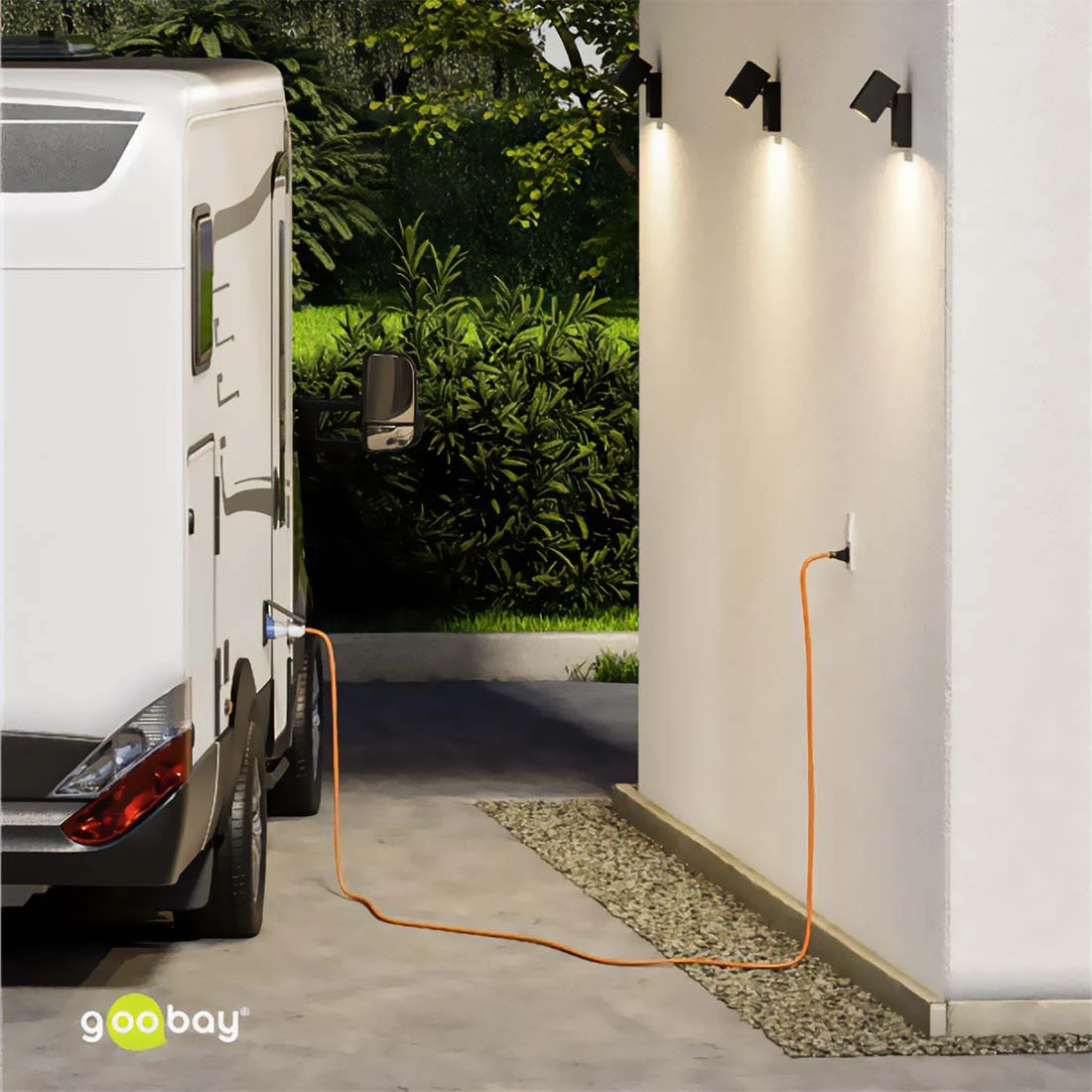 Przejściówka sprawdza się idealnie w warunkach zewnętrznych. Dzięki precyzyjnej konstrukcji, klasie szczelności IP44 i klapce zabezpieczającej gniazdo CEE, chroni przed wilgocią i zabrudzeniami. Jasnopomarańczowy kabel jest dobrze widoczny na trawie czy żwirze, co zwiększa łatwość poruszania się na kempingu, parkingu lub działce. To praktyczne rozwiązanie w terenie, podczas biwaków, w ogrodzie czy na postoju.