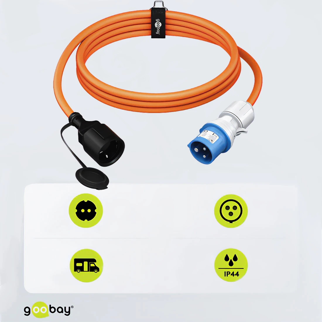 Przejściówka sprawdza się idealnie w warunkach zewnętrznych. Dzięki precyzyjnej konstrukcji, klasie szczelności IP44 i klapce zabezpieczającej gniazdo styku ochronnego, jest odporna na zachlapania. Jasnopomarańczowy kabel jest dobrze widoczny na trawie czy żwirze, co zwiększa bezpieczeństwo poruszania się na kempingu, parkingu lub działce. To praktyczne rozwiązanie w terenie, podczas biwaków, w ogrodzie czy na postoju.