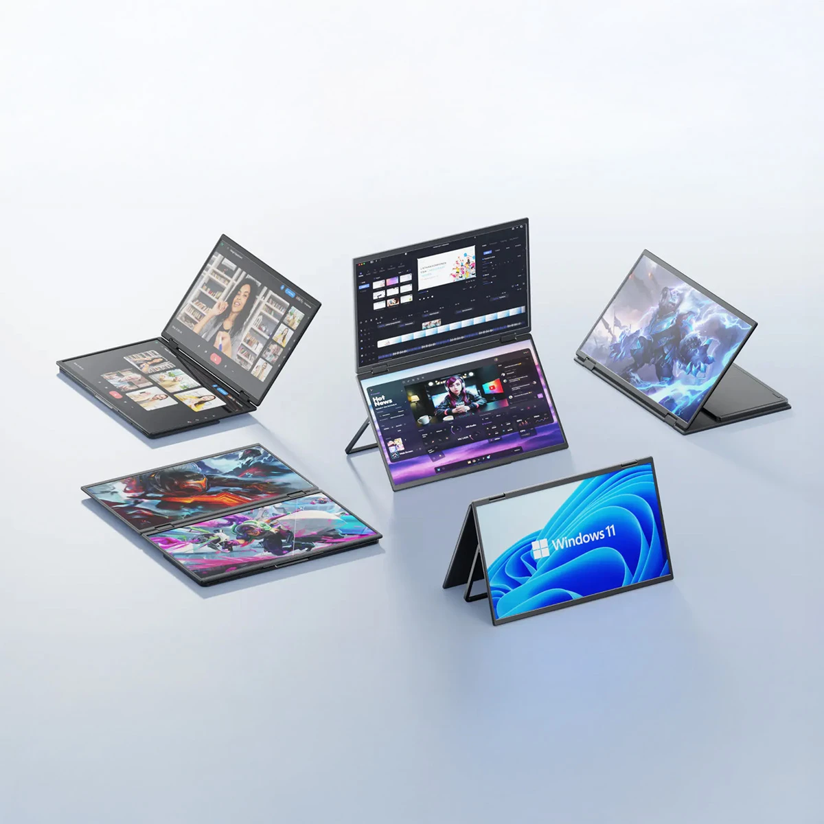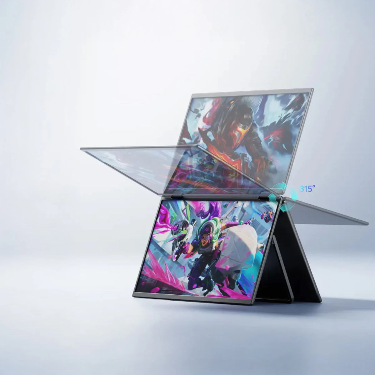 Podwójny monitor Minisforum MDSA156 swoim kształtem przypomina laptopa. Zawiasy łączące oba ekrany pozwalają Ci na swobodne ustawienie ich pozycji w zakresie aż 315°. Dzięki temu będziesz mógł bezproblemowo oglądać wspólnie film z kimś, kto siedzi naprzeciwko Ciebie. Jednak co więcej, będziesz w stanie ustawić go również pionowo, jeden ekran nad drugim. Dzięki ustawieniu pionowemu, zamiast poziomego będziesz mógł korzystać z ekranu nawet w miejscach o ograniczonej przestrzeni. Lekka, składana konstrukcja monitora, sprawi natomiast, że będziesz w stanie mieć go zawsze przy sobie.