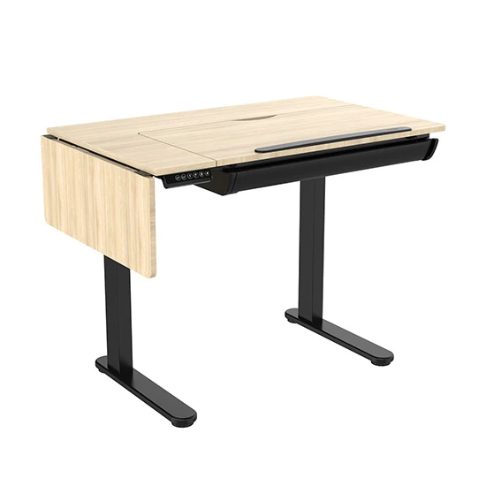 Stół kreślarski Spacetronik DOLF to nie tylko pochylany blat i zaawansowany kontroler. Został on zbudowany w taki sposób, żebyś mógł dopasować go nawet do najmniejszej przestrzeni. Wszystko z uwagi na dodatkową, składaną, boczną część blatu. Gdy będziesz chciał zmieścić biurko w małym pokoju, wystarczy tylko, że złożysz boczną część blatu o 90°. Zyskasz w taki sposób aż 25 cm wolnego miejsca. W takiej sytuacji będziesz miał oczywiście mniej przestrzeni roboczej na swoje najważniejsze przedmioty. Dlatego też, żeby Ci to zrekompensować, pod blatem znajdziesz pojemną wysuwaną szufladę. Dzięki niej zachowasz porządek na swoim blacie, co wpłynie pozytywnie na Twoją kreatywność i produktywność.