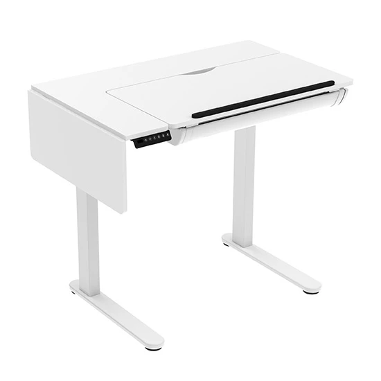 Stół kreślarski Spacetronik DOLF to nie tylko pochylany blat i zaawansowany kontroler. Został on zbudowany w taki sposób, żebyś mógł dopasować go nawet do najmniejszej przestrzeni. Wszystko z uwagi na dodatkową, składaną, boczną część blatu. Gdy będziesz chciał zmieścić biurko w małym pokoju, wystarczy tylko, że złożysz boczną część blatu o 90°. Zyskasz w taki sposób aż 25 cm wolnego miejsca. W takiej sytuacji będziesz miał oczywiście mniej przestrzeni roboczej na swoje najważniejsze przedmioty. Dlatego też, żeby Ci to zrekompensować, pod blatem znajdziesz pojemną wysuwaną szufladę. Dzięki niej zachowasz porządek na swoim blacie, co wpłynie pozytywnie na Twoją kreatywność i produktywność.