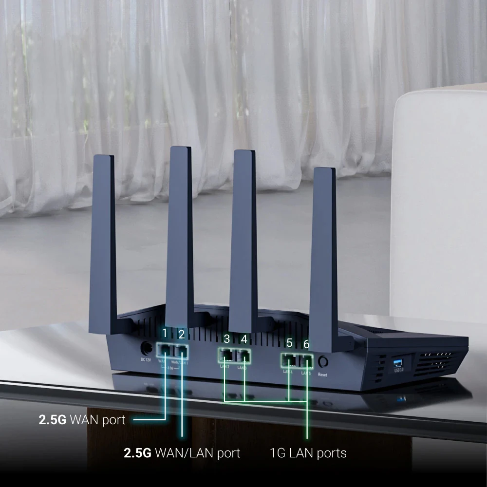 - Porty Ethernet: 2 x 2.5G (10/100/1000/2500 Mbps): 1 x WAN, 1 x WAN/LAN, 4 x 1G LAN (10/100/1000 Mbps)