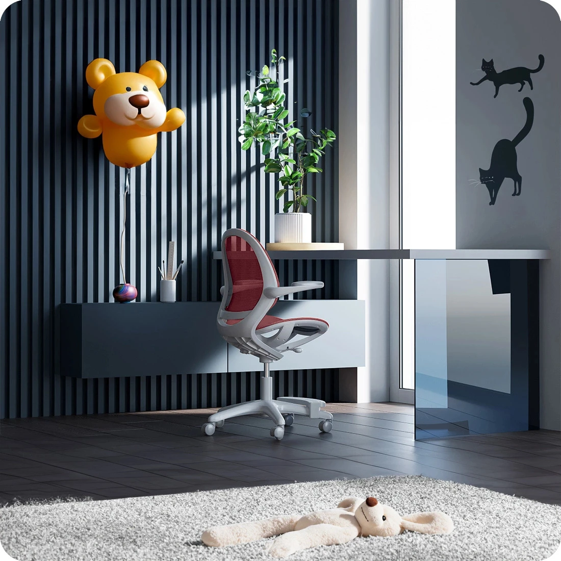Podłokietniki zostały zaprojektowane z myślą o maksymalnym komforcie i wsparciu dla dziecka. Ergonomiczny kształt pozwala na utrzymanie prawidłowej pozycji rąk, co wspiera zdrową postawę i redukuje napięcie mięśniowe w ramionach i barkach. Dzięki możliwości podniesienia podłokietników, w zależności od preferencji dziecka można z nich korzystać lub nie, zapewniając mu jeszcze większy komfort podczas nauki, zabawy czy odpoczynku.