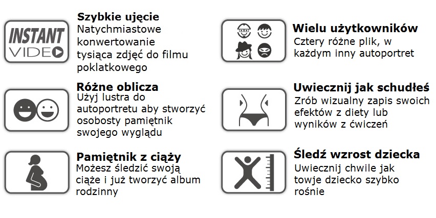 Jest to całkiem nowa koncepcja do codziennego rejestrowania zdjęć. Wcześniej używane aparaty cyfrowe i smatrfony powodowały że mieliśmy wiele zdjęć, które czasami stawały się niepotrzebne. Dzięki kamerze poklatkowej możesz kilkanaście zdjęć zapisać w krótkim nagraniu poklatkowym!