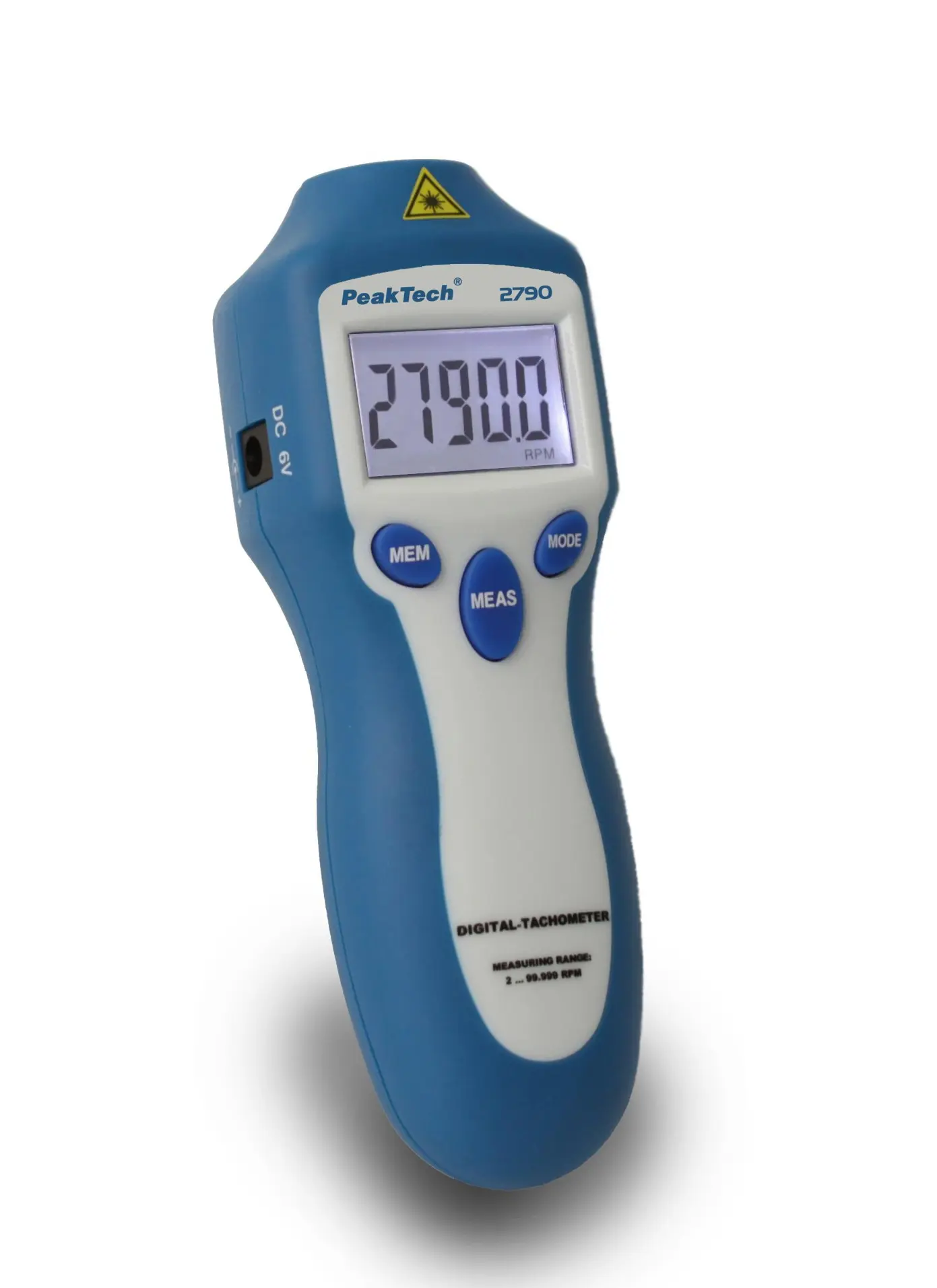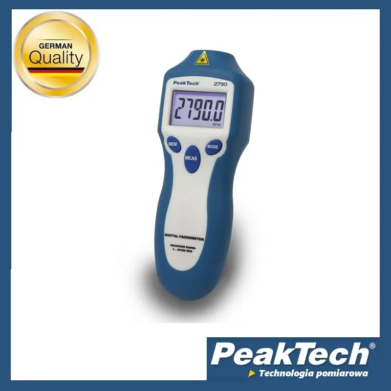 Tachometr cyfrowy z 5-cyfrowym podświetlanym wyświetlaczem LCD 13 mm. Zapewnia szybkie i dokładne, bezdotykowe pomiary prędkości obrotowej (RPM) oraz tryb zliczania łącznej liczby obrotów (REV). Funkcja lasera zapewnia szybki i dokładny pomiar prędkości wirujących obiektów z dystansu. Z wbudowanej pamięci można wywołać min/max. oraz ostatnią zapamiętaną wartość. Urządzenie posiada wbudowany akumulator, dzięki czemu mamy mozliwość pomiarów mobilnych (9V) lub pomiary stacjonarne z mozliwością podłączenia zasilacza 6V. Całość została wykonana z najwyższej klasy plastików, a zintegrowana antypoślizgowa guma zapewnia wygodne użytkowanie urządzenia i przede wszystkim zabezpiecza przed wyślizgnięciem się urządzenia z reki, co daje nam stabilne i łatwe użytkowanie urządzenia nawet w trudnych warunkach.