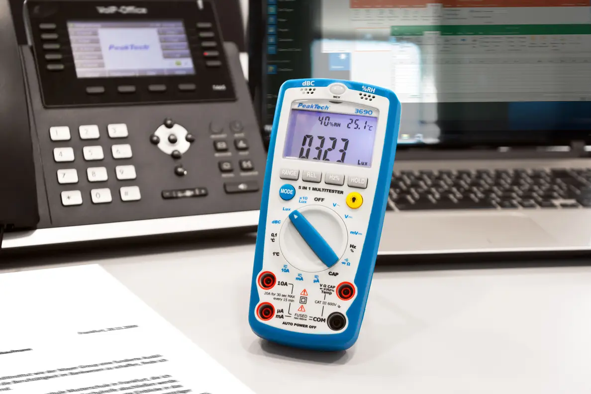 Nowo opracowany cyfrowy miernik "5 w 1" jest przeznaczony do łączenia funkcji środowiskowych, takich jak pomiar poziomu dźwięku, natężenia światła, pomiaru wilgotności i temperatury z funkcjami multimetru.