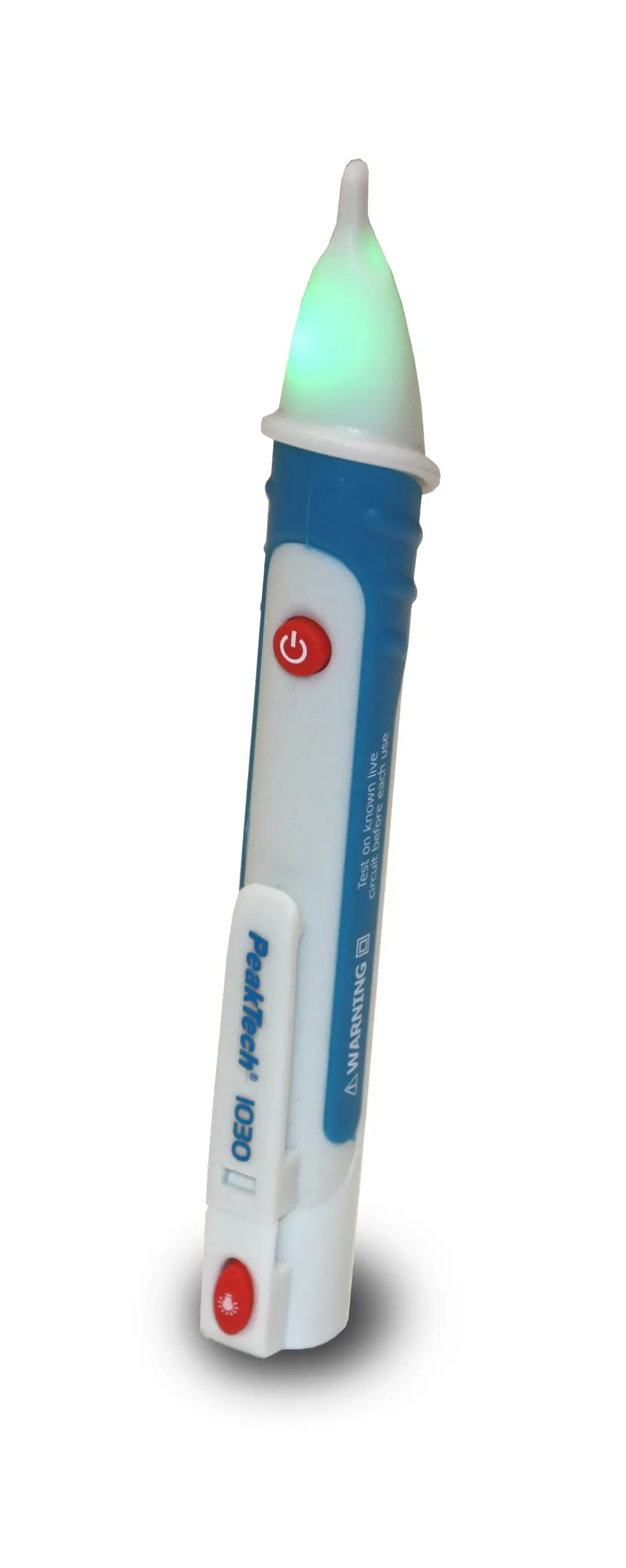 Łatwy w użyciu, do bezdotykowej detekcji napięcia AC od 90 V do 1000 V. Pasuje do gniazdek, gniazd lamp lub do testowania izolacji przewodów. Nadaje się do śledzenia przewodu kabli podtynkowych i lokalizacji przerw linii. Jeżeli wykryje napięcie AC w punkcie pomiarowym, użytkownik jest informowany wizualnie poprzez miganie czerwonej diody LED oraz sygnałem dźwiekowym. Sonda świeci na zielono, gdy punkt pomiarowy nie jest pod napięciem.