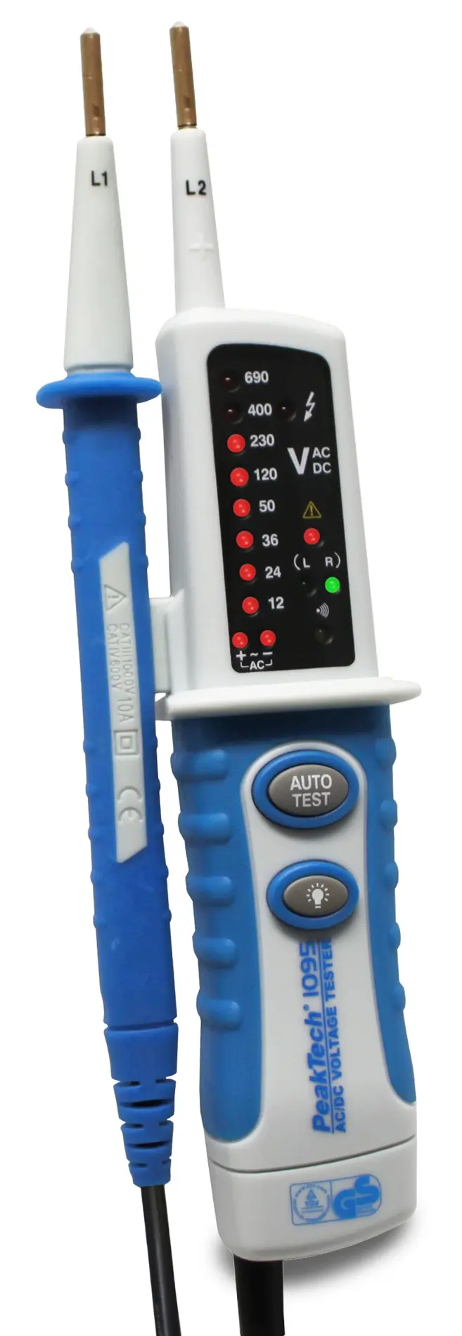 Słupkowy tester napięcia z wyswietlaczem LED do pomiaru AC/DC od 12V do 690V, zapewnia ponadto szeroki zakres funkcji pomiarowych. Najważniejsze z nich to oświetlony punkt pomiarowy, test ciągłości obwodu z sygnałem dźwiekowym i wizualnym, a ponadto wskaźnik faz i kierunku.
