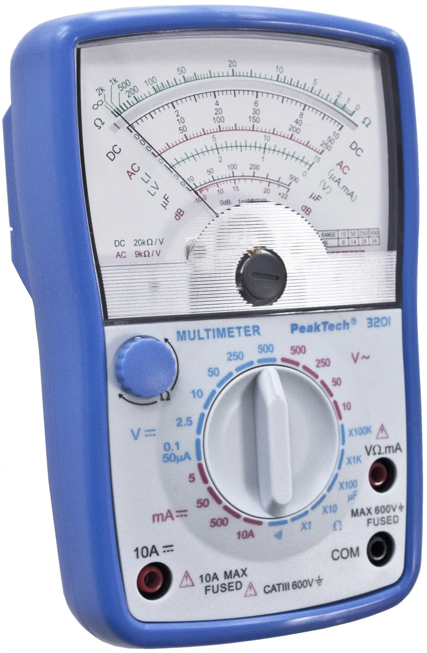 Ten multimetr analogowy dysponuje wieloma funkcjami pomiarowymi, jak pomiar napięcia AC i DC, prądu stałego, rezystancji z kontrolerem ciągłości lub pomiar dB.