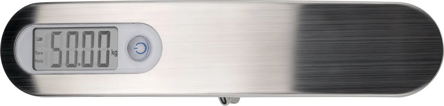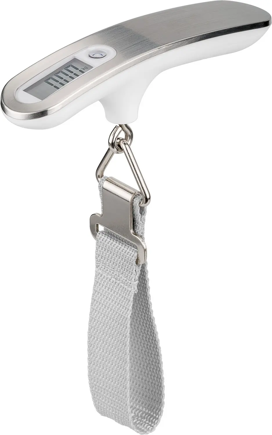 Waga bagażowa z cyfrowym wyświetlaczem. Maksymalny udźwig do 50 kg. Kolor srebrny, wykonana z trwałego stopu metali.