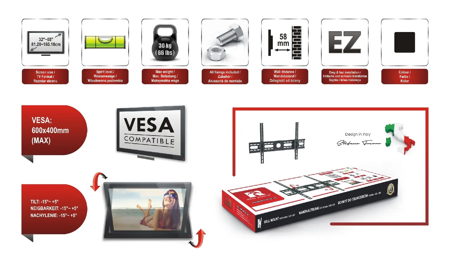 Został zaprojektowany z myślą o montażu dużych i małych telewizorów na ścianie o przekątnej ekranu 32" – 65”.