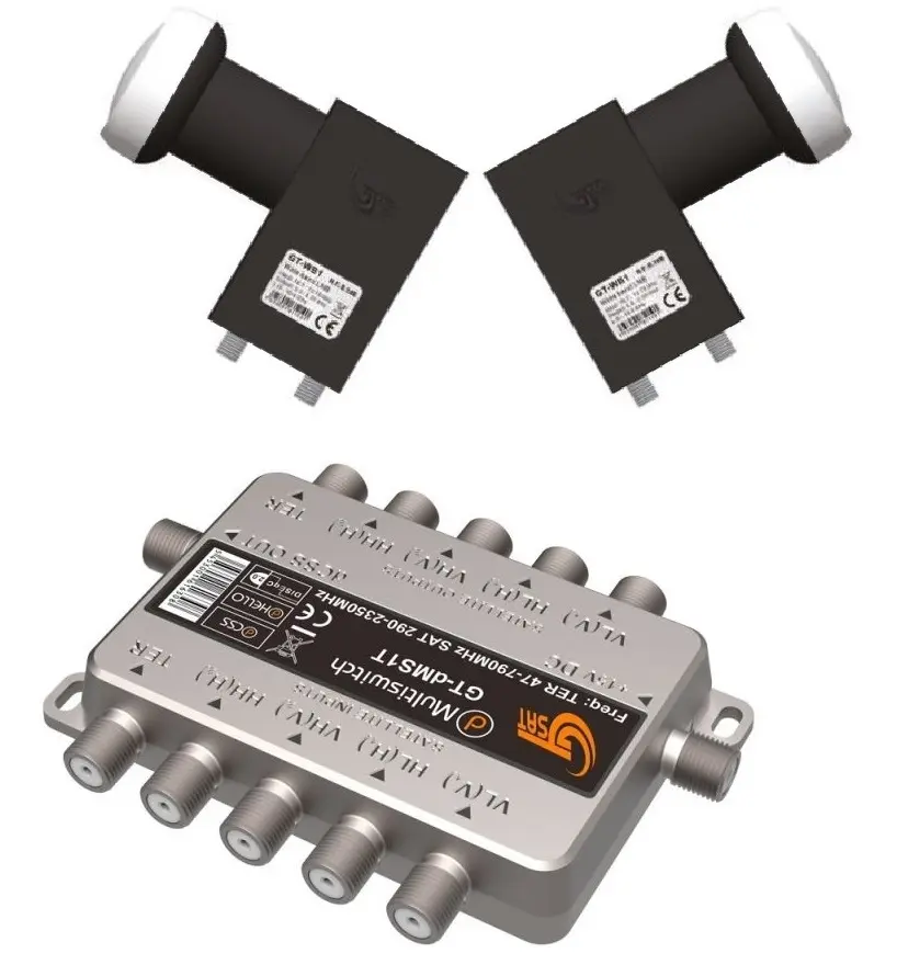 W skład zestawu wchodzi 1x Multiswitch GT-dMTS1T i 2x Konwerter Wide Band GT-WB1.