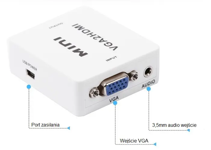 - wejście sygnału VGA + wyjście 3.5mm audio do konwersji na sygnał HDMI