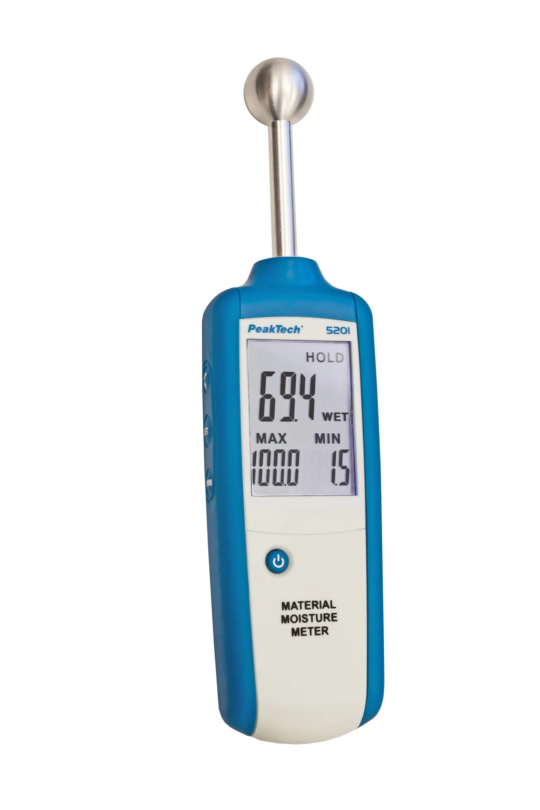 Ten nowy miernik wilgotności materiału pozwala użytkownikowi na szybki i nieniszczący pomiar wilgotności na wszystkich rodzajach materiałów budowlanych, drewnie, ścianach i stropach budynków. Miernik pokazuje pomiar wilgotności bezwzględnej oraz minimalnej i maksymalnej na dużym podświetlanym wyświetlaczu cyfrowym. Urządzenie pozwala zachować bieżącą wartość mierzoną na wyświetlaczu poprzez naciśnięcie przycisku wstrzymania. Oprócz zmierzonych wartości, urządzenie pokazuje takżę komunikat "sucha, mokra lub ryzyko", a także informuje sygnałem dźwiękowy. Sygnał ostrzegawczy dla wysokich wartości wilgotności. Aby wykonać szybki i dokładny pomiar, miernik wykorzystuje opór elektryczny materiału, a także wykonuje auto-kalibrację po włączeniu urządzenia. Różnorodność funkcji i obsługi tego urządzenia sprawia, że idealnie nadaje się dla właścicieli budynków, architektów, rzemieślników i hobbystów. Urządzenie posiada możliwość wymiany sondy testowej.