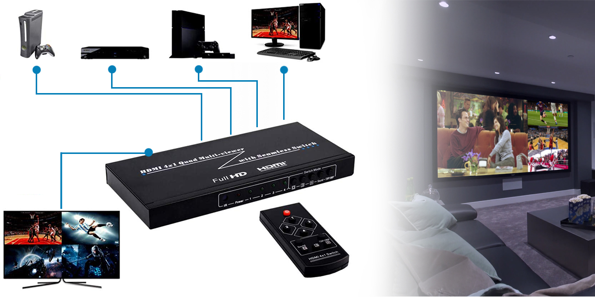 Urządzenie Multi-Viewer pozwala na wyświetlanie obrazu z czterech źródeł HDMI (1920x1080, 60FPS) na jednym ekranie. Obraz jest bezstratny, wyraźny i ma głębokie barwy. Jako urządzenie typu Multi-Viewer, pozwala wyświetlać obraz w czterech konfiguracjach.