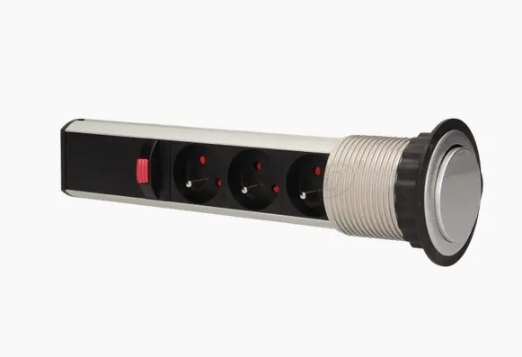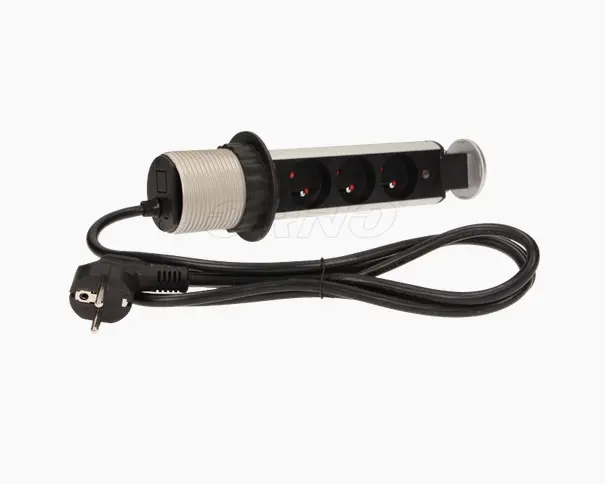Zestaw trzech gniazd sieciowych 2P+Z z uziemieniem w obudowie chowanej w blat. Urządzenie przeznaczone do montażu w stołach konferencyjnych, blatach mebli biurowych i kuchennych. Wymaga minimalnej ilości miejsca pod blatem, posiada wysuwany panel z gniazdami oraz dodatkową blokadę. Wyposażone w przewód o długości 1,8 m. Kolor Inox