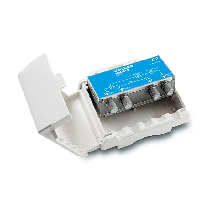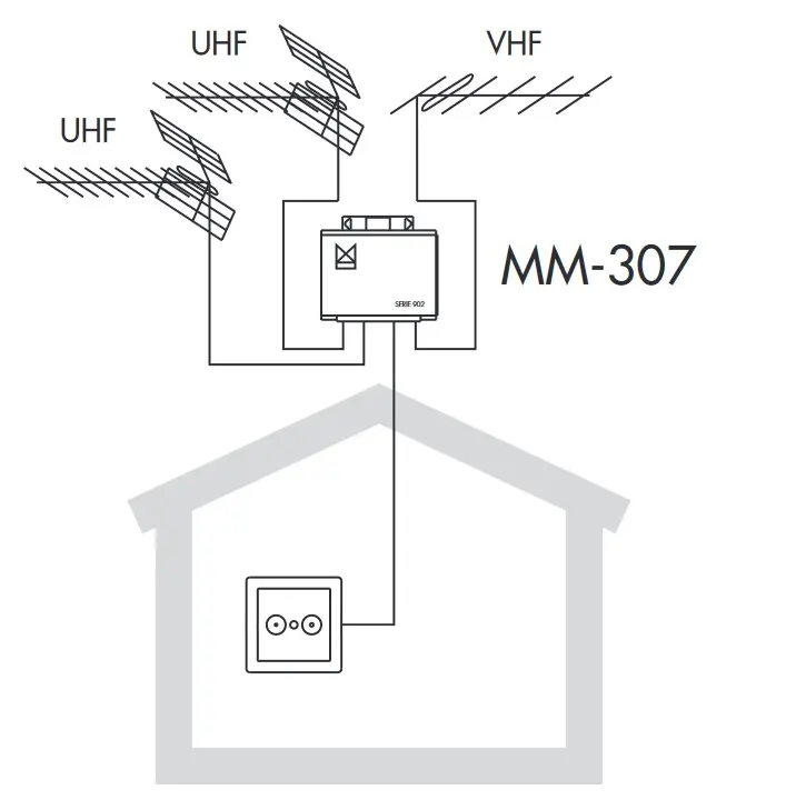 Model MM-307 sumuje sygnały typu: 2xUHF oraz VHF lub FM. Całość jest podawana dalej na jednym przewodzie koncentrycznym 75 Ohm.