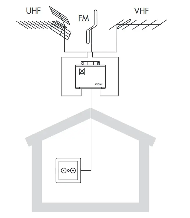 Model MM-200 sumuje sygnały typu: TV/FM. Całość jest podawana dalej na jednym przewodzie koncentrycznym 75 Ohm.