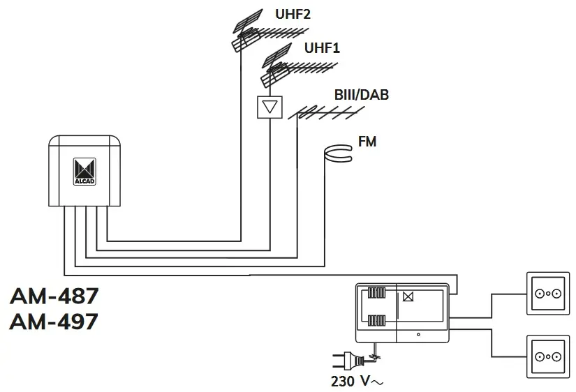 Model AM-497 sumuje sygnały typu: 2xUHF+VHF+FM. Całość jest podawana dalej na jednym przewodzie koncentrycznym 75 Ohm.