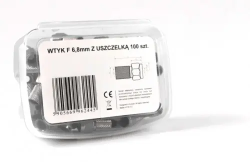 Wtyk typu F o średnicy 6,8 mm z uszczelką do podłączenia kabla antenowego.